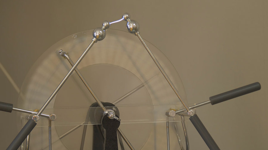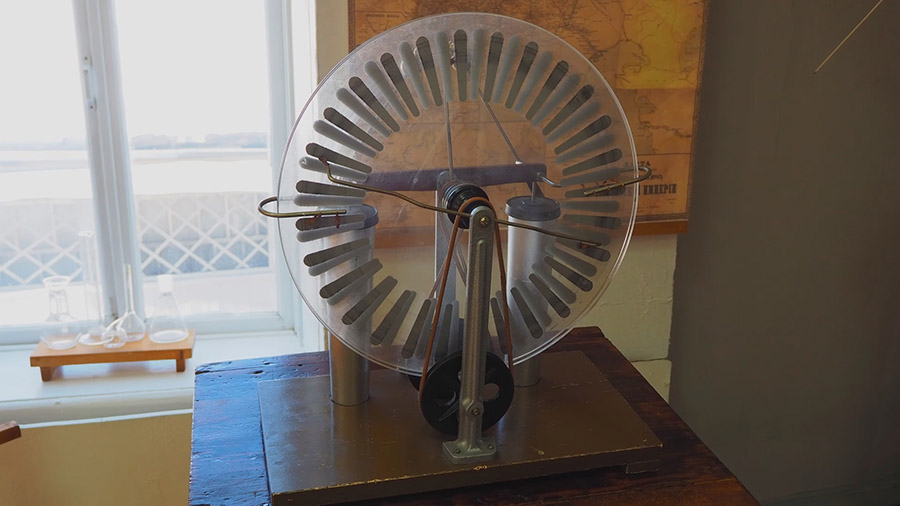 Электрофорная машина. Вспоминают ученицы, что рассказывая о электрофорной машине, он выстраивал их цепочкой. Они крепко брали друг друга за руки. А ближайший к этой машине – вот за те два шарика. А Циолковский начинала разгон ее. Дикий визг, слезы, а потом полный восторг, восхищение. Ну и, конечно, электрофорная машина – любимейший экспонат у наших посетителей. Все пытаются ее покрутить.