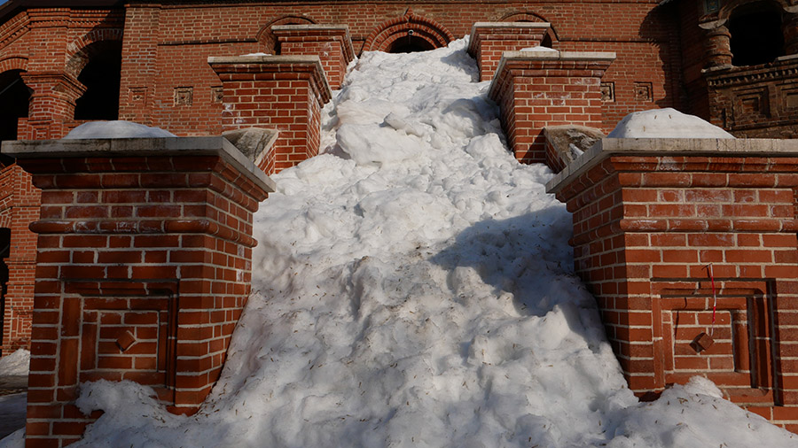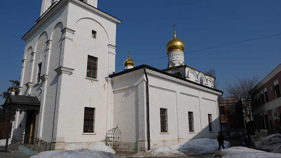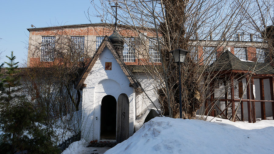 Поплутав по этому кварталу, мы вырулили к храму в Старом Симонове, с которого планировали начать. Перешагнули линию ворот — и очутились в прошлом. Или в таком альтернативном настоящем, где снег не посыпают и не слишком убирают, где растут густые деревья, а главное — совершенно не слышно шума городского.