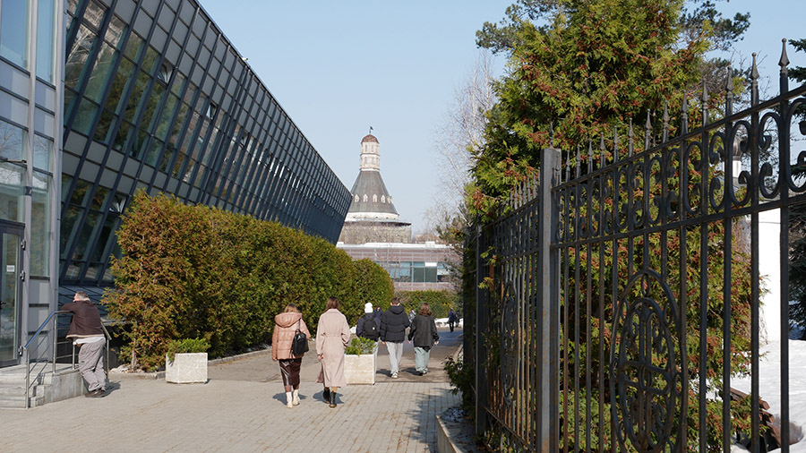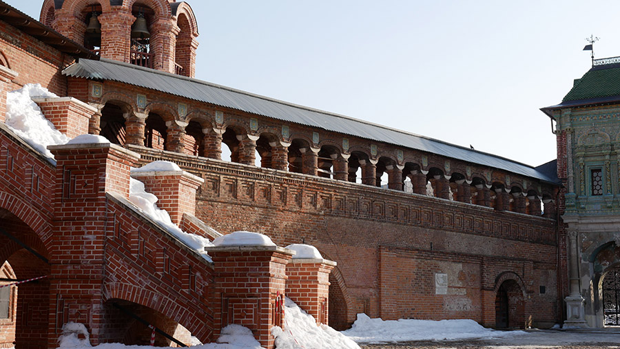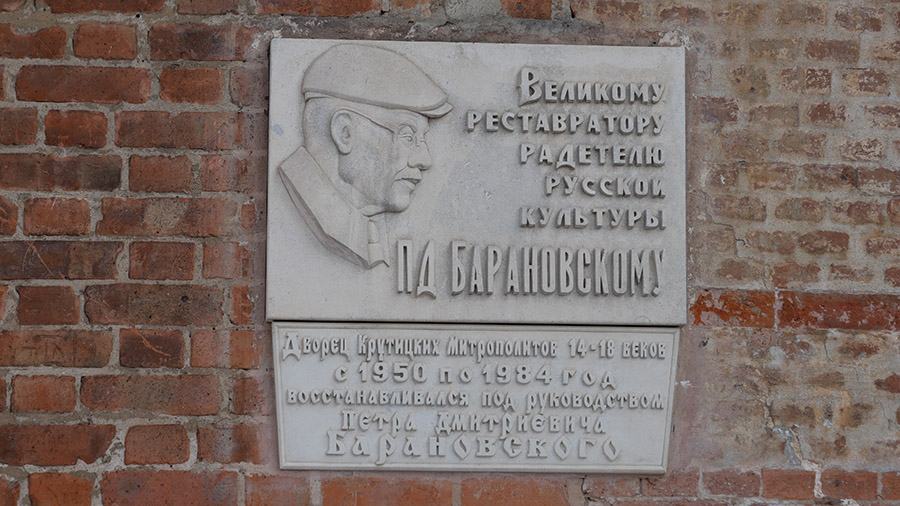 Длиннейшая галерея с колоночками — «стена-переход», построенная одновременно с «Теремком». На стене — мемориальная доска Барановскому, для которого Крутицы были любимейшим детищем. Может, поэтому тут так патриархально и уютно? Барановский по сей день охраняет?