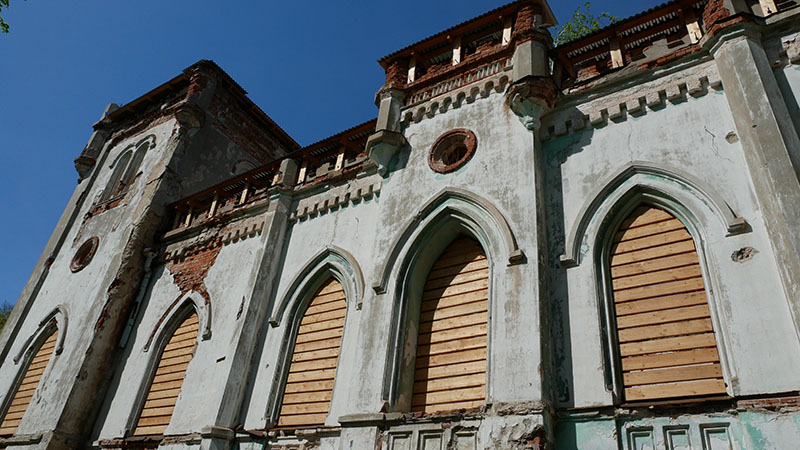 …и стали думать – а что мы тут еще не видели? И наткнулись на усадьбу Колосово Чертковых, в неоготическом стиле. Она, правда, в руинах, но вот – началась если не реставрация, то хотя бы консервация. Окна заколотили, верх накрывают. Рядом стоит щит с планами восстановления.